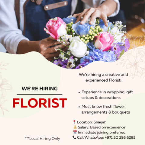 HIRING FLORIST - full time, Languages Required Fluent Arabic Our busy flower shop needs a talented florist to join us Immediately What You'll Do Create beautiful bouquets and floral arrangements. Help customers pick the perfect blooms. Learn and grow your floral design skills. Location Al Dhaid, Sharjah
