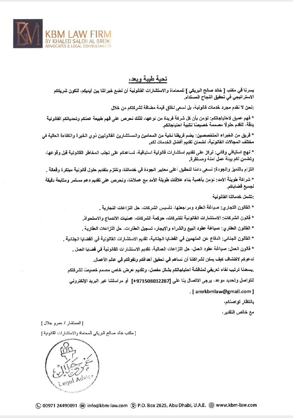 يقدم مكتب خالد صالح البريكي للمحاماة والاستشارات القانونية خدمات قانونية شاملة للشركات، تشمل القانون التجاري والشركات والعقارات والجنائي والعمل. يركز المكتب على فهم احتياجات العملاء، وتقديم حلول مخصصة، يضم المكتب فريقا من الخبراء المتخصصين، ويلتزم بأعلى معايير الجودة، ويسعى لبناء شراكات طويلة الأمد. يمكن التواصل مع المكتب لترتيب لقاء تعريفي ومناقشة الاحتياجات القانونية
