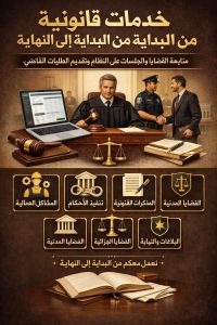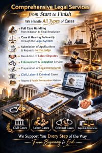 توفير خدمات قانونية من البداية الى النهاية في جميع القضايا مع متابعة القضايا والجلسات على النظام وتقديم الطلبات للقاضي وحل المشاكل العمالية والتنفيذ والمذكرات القانونية والقضايا المدنية والعمالية والبلاغات الجزائية والنيابة بأسعار منافسة جدا