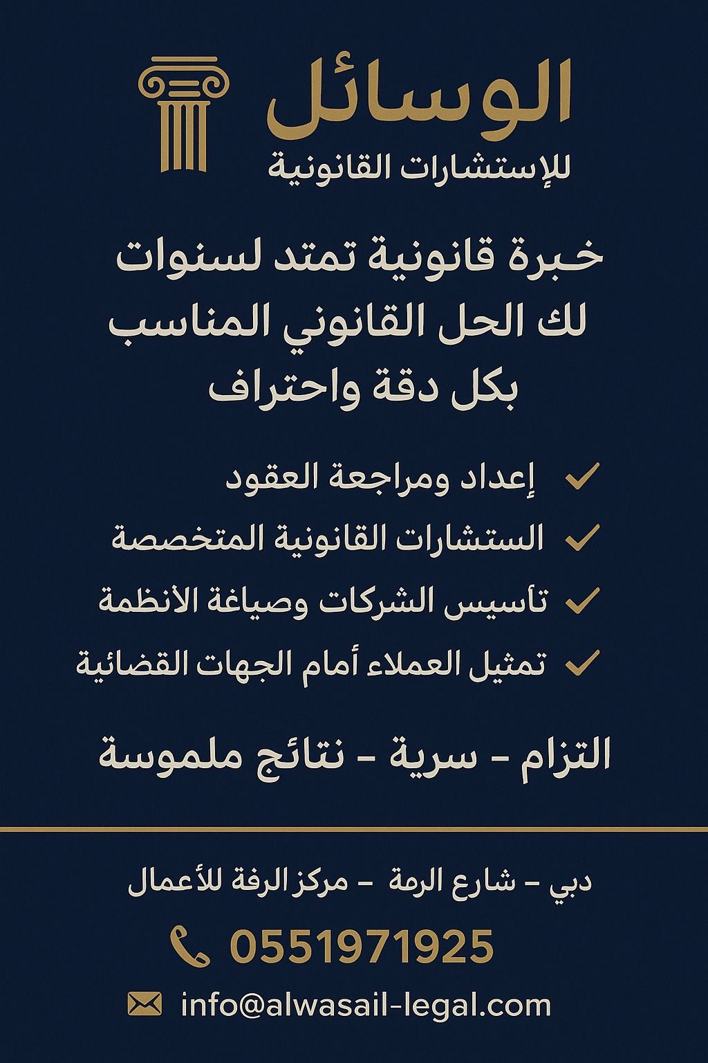 عندك مشكلة قانونية أو محتاج استشارة قبل ما تخطو أي خطوة تواصل مع شركة الوسائل للاستشارات القانونية وخلي فريقنا من المحامين والمستشارين يتولى الأمر باحترافية تامة خدماتنا صياغة العقود والانذارات تمثيل أمام الجهات القضائية تأسيس الشركات استشارات قانونية دقيقة لا تتردد. استشارتك القانونية تبدأ من هنا. دبي - مركز الرقة للأعمال