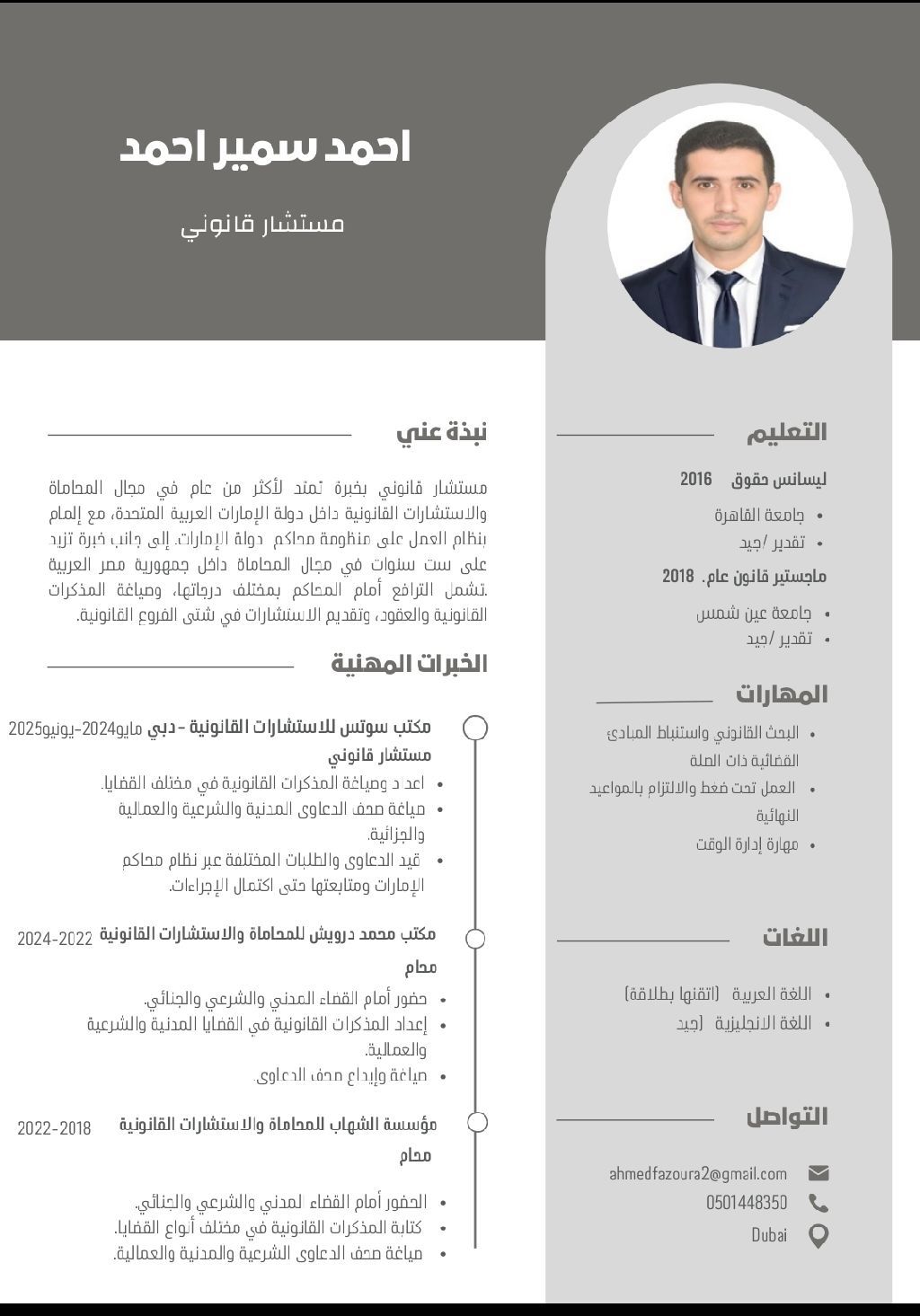 محام ومستشار قانوني مقيم في دبي، حاصل علي ماجستير في القانون العام، أتمتع بخبرة تجاوز العام داخل دولة الامارات كمستشار قانوني، ولدي خبرة واسعة في اعداد المذكرات القانونية، الى جانب العمل علي نظام محاكم الامارات. الى جانب خبرة تجاوز الست سنوات داخل مصر