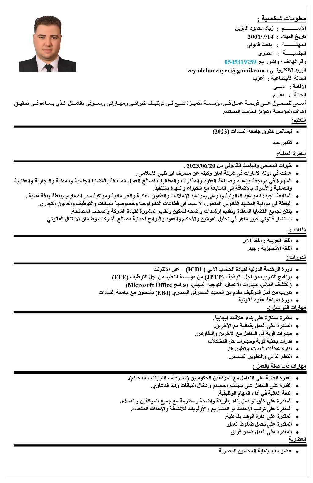 أنا محامي مصري متواجد في دولة الامارات العربية المتحدة أحمل إقامة سارية حتى 2027 ابحث عن وظيفة باحث قانوني لدي الخبرة بالعمل بمكاتب المحاماة في جمهورية مصر العربية ولدي الخبرة الكاملة بالعمل على المواقع الالكترونية لمحاكم دبي وأبوظبي والاتحادي من حيث قيد الدعاوي وفتح ملفات التنفيذ ومتابعتها مرفق لحضراتكم السيرة الذاتية