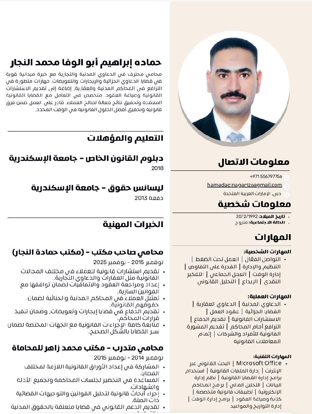مستشار قانوني خبرة عشر سنوات في مجال المحاماة حاصل على ليسانس حقوق 2013 حاصل على دبلوم القانون الخاص 2018 خبرة في الدعاوى المدنية ودعاوى التعويضات ودعاوى الإيجارات والتنفيذ خبير في الدعاوى الجزائية محترف في كتابة صحف الدعاوى واعداد المذكرات وكتابة ومراجعة العقود واللوائح