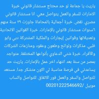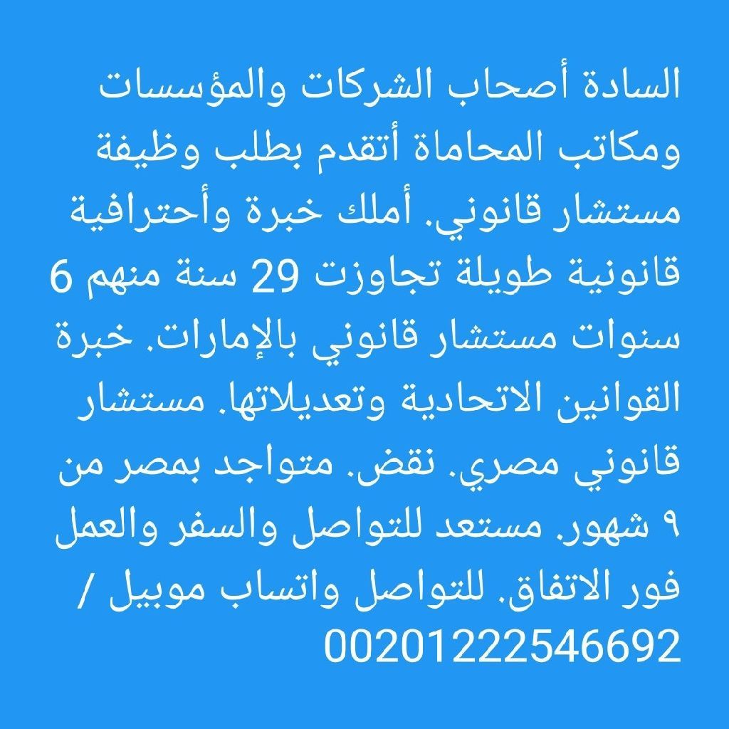 أطلب العمل الفوري. خبرة واحترافية طويلة جاوزت 29 سنة منهم 6 سنوات مستشار قانوني في الامارات. مستشار قانوني مصري. نقض. خبرة القوانين الاتحادية وتعديلاتها وقوانين إيجارات والملكية المشتركة دبي وأبو ظبي. مذكرات ولوائح وطعون وعقود ومنازعات الشركات والأفراد. خبرة شتي الدعاوي. خبرة واحترافية وقيادة وتعاون وتمثيل العملاء بكفاءة. نتائج ملموسة. أطلب العمل. مستعد للتواصل