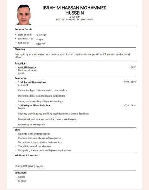 حاصل على ليسانس حقوق خبرة 10 سنوات داخل الدولة يوجد اقامة قابلة للإعارة رخصة قيادة اماراتية على دراية كاملة بكافة قوانين الدولة اجادة صياغة جميع المذكرات في القضايا التجارية المدنية أحوال شخصية القضايا العمالية القضايا الجزائية عملت بالعديد في مكاتب المحاماة داخل الدولة وكذا مستشار قانوني لبعض شركات المقاولات داخل الدولة وتحصيل الديون على دراية واسعة بسيستم المحاكم الاتحادية
