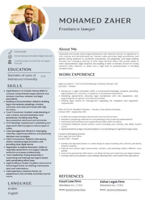 محام حاصل على خبرة في اعداد المذكرات القانونية، متابعة القضايا، وصياغة العقود. امتلك مهارات قوية في التحليل القانوني، والبحث، والعمل تحت الضغط. جاهز للانضمام فورا والعمل ضمن فريق محترف