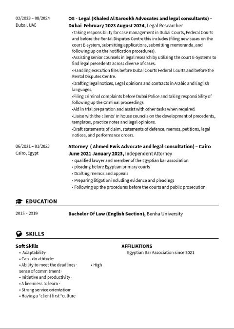 Egyptian lawyer looking for work with experience in laws, writing initial papers, civil, commercial, labor, rental, and criminal memoranda, personal status matters, interpreting civil contracts, responding and commenting on expert and arbitrator reports, objecting to rulings, writing appeals, implementation issues, checks, and all types of appeals. I have more than 5 years of experience in Egypt