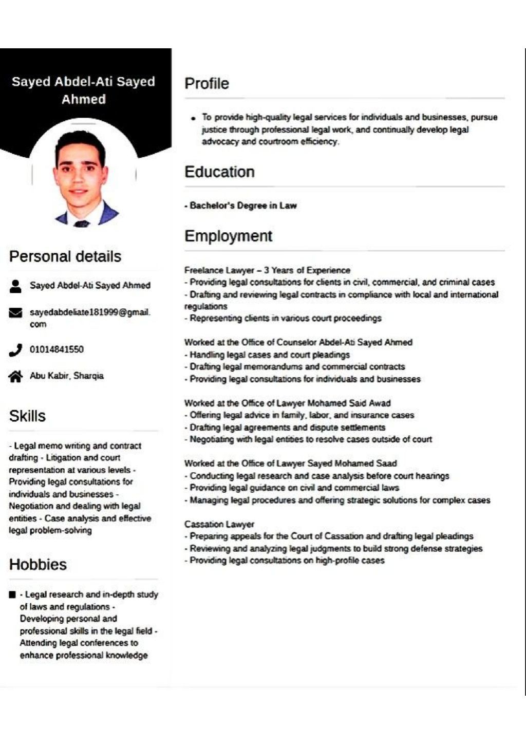 Egyptian lawyer looking for work with experience in laws, writing initial papers, civil, commercial, labor, rental, and criminal memoranda, personal status matters, interpreting civil contracts, responding and commenting on expert and arbitrator reports, objecting to rulings, writing appeals, implementation issues, checks, and all types of appeals. I have more than 5 years of experience in Egypt