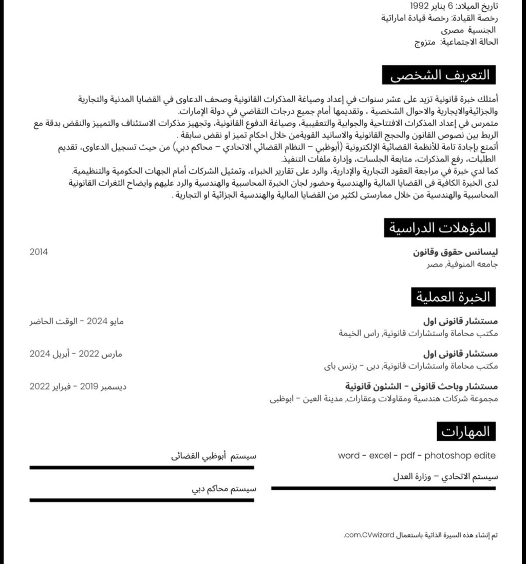 مستشار قانوني يتمتع بخبرة مهنية تزيد عن عشر سنوات في مجالات التقاضي والاستشارات القانونية داخل دولة الامارات مع خبرة واسعه في اعداد وصياغة المذكرات ولوائح الدعاوي في الدعاوي المدنيه والتجاريه والعماليه والأحوال الشخصيه والأيجاريه والتنفيذات بكافة أنواعها متمكن من استخدام الأنظمة القضائيه سيستم أبو ظبي ودبي والاتحادي ورأس الخيمة والنيابات العامة في أبوظبي ودبي والشارقة والاتحادية مع مراجعة العقود