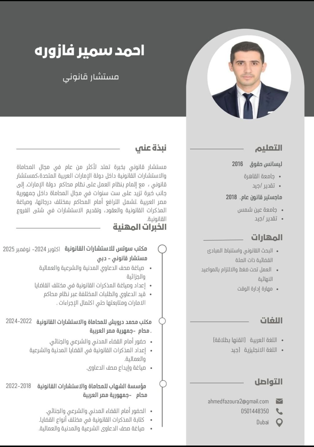 محام ومستشار قانوني مقيم في دبي، حاصل علي ماجستير في القانون العام. حيث أتمتع بخبرة تزيد علي عام في مجال المحاماة داخل دولة الامارات العربية المتحدة كمستشار قانوني، الى جانب خبرة تزيد علي ست سنوات داخل مصر ولدي خبرة عملية في العمل على أنظمة محاكم دولة الامارات، مع المام كامل باجراءات تقديم الطلبات ومتابعتها عبر النظام