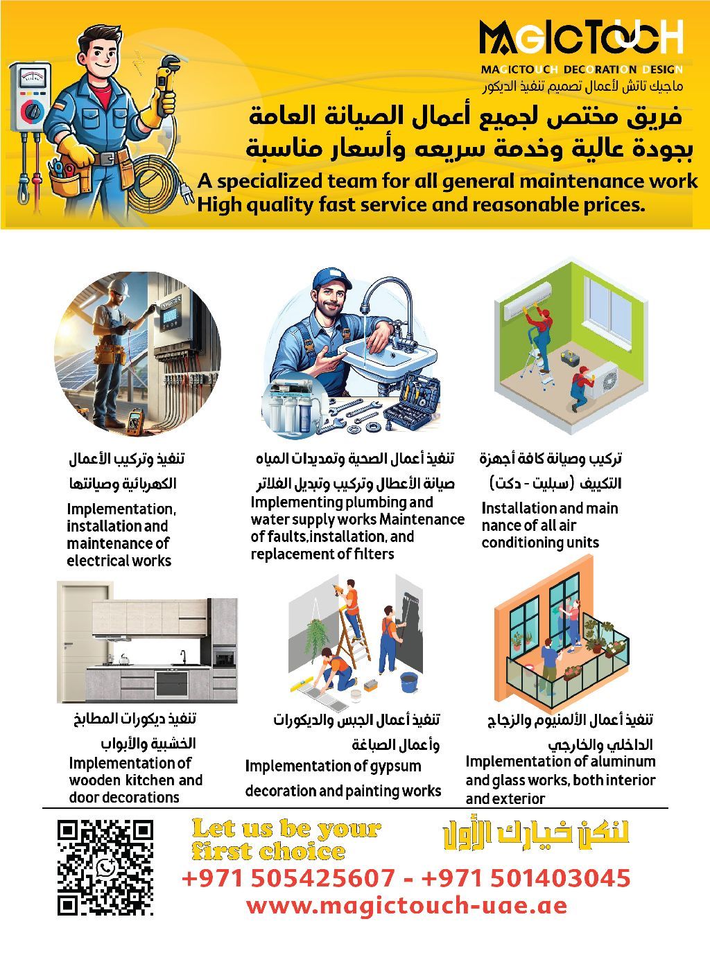 فريقنا جاهز لتلبية طلبك في أعمال الصيانة الكهربائية وأعمال الأصباغ والديكورات والجبس والانارة وأعمال الصحية وتمديدات المياه وكافة الصيانات العامة لا تتردد بالاتصال بنا وطلب خدمتك
