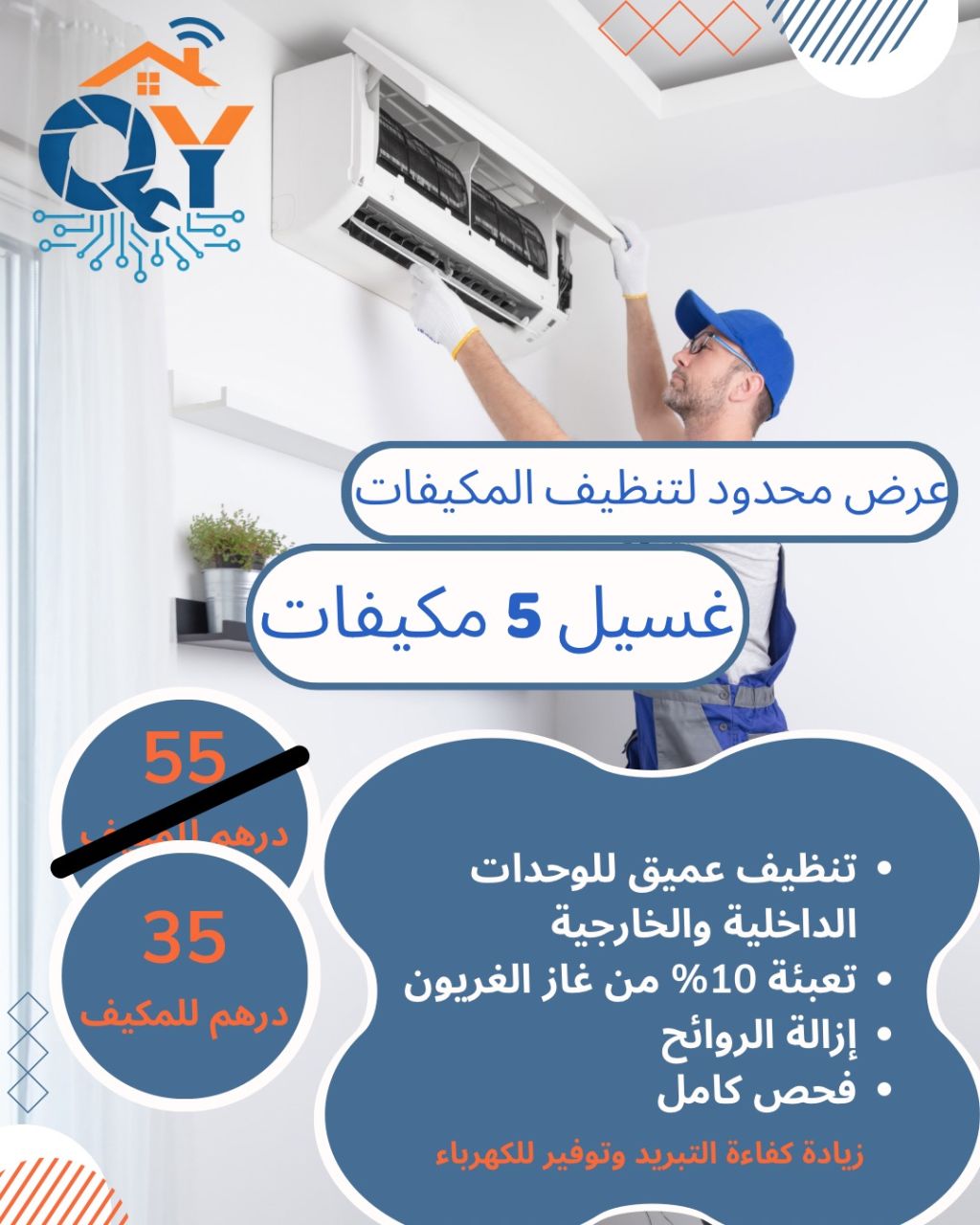 هل يعمل نظام التكييف لديك بكفاءة أقل من المعتاد داء وجودة الهواء. نقدم خدمة تنظيف المكيفات (الوحدات الداخل قد يكون التنظيف الدوري هو الحل لتحسين الأداء باحترافية عالية بهدف رفع كفاءة التشغيل واطالة عمر الجهاز. تشمل الخدمة تحسين كفاءة التبريد - غسيل الوحدات (الداخلية والخارجية) تقليل استهلاك الطاقة - ازالة الروائح غير المرغوبة - فحص سريع لضمان الأداء فقط 35 لكل مكيف
