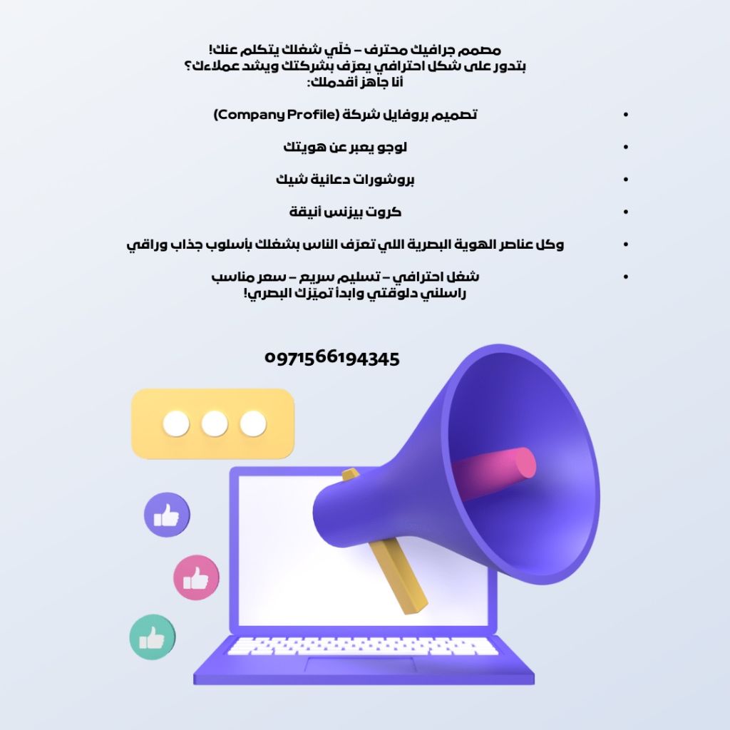 مصمم جرافيك محترف - خلي شغلك يتكلم عنك بتدور على شكل احترافي يعرف بشركتك ويشد عملاءك أنا جاهز أقدم لك تصميم بروفايل شركة (Company Profile) لوجو يعبر عن هويتك بروشورات دعائية شيك كروت بزنس أنيقة وكل عناصر الهوية البصرية اللي تعرف الناس بشغلك بأسلوب جذاب وراقي شغل احترافي - تسليم سريع - سعر مناسب راسلني دلوقتي وابدأ تميزك البصري