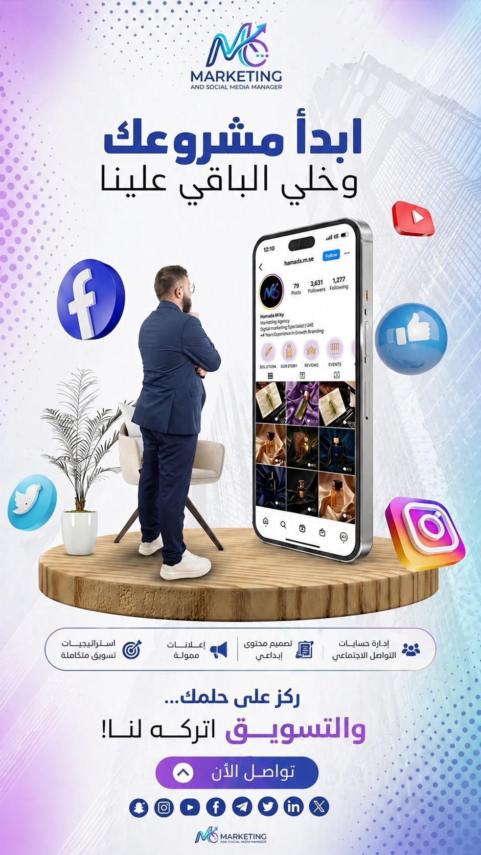 نقدم لك إدارة كاملة لكل حساباتك (Instagram - Facebook - TikTok - Snapchat) خطة محتوى مدروسة حسب نشاطك وجمهورك تصميمات جذابة توقف السكرول كتابة محتوى تسويقي يقنع العميل ويخليه يشتري إدارة اعلانات ممولة تحقق أفضل عائد (ROI) رد سريع على الرسائل والتعليقات لزيادة الثقة تقارير شهرية بالأرقام والنتائج مش بنوعدك بتفاعل وبس نشتغل على زيادة المبيعات فعليا
