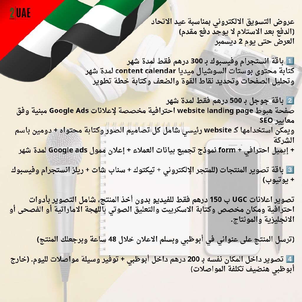 ب 300 درهم فقط محتوى سوشيال ميديا لمدة شهر / ب 500 درهم فقط ويب سايت ودومين واعلان جوجل لمدة شهر / تصوير اعلان UGC ب 150 درهم فقط مع ارجاع المنتج / جلسة تصوير فيديو كاملة ب 200 درهم فقط / الدفع بعد الاستلام لا يوجد دفع مقدم) العرض ساري حتى يوم 2 ديسمبر فقط / التفاصيل في صورة الاعلان / التفاصيل