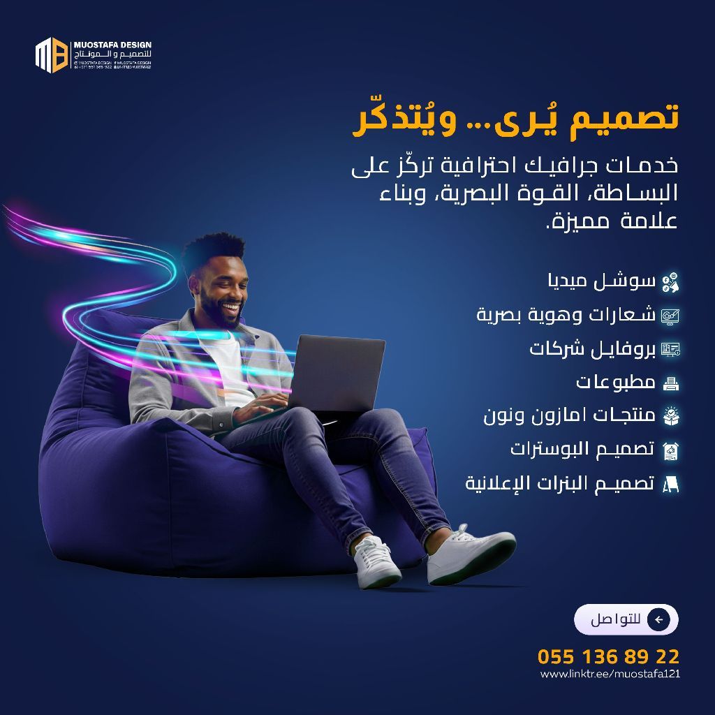 هل تبحث عن هوية بصرية تميز مشروعك أنا مصطفى ديزاين مصمم جرافيك بخبرة أكثر من 3 سنوات أقدم لك تصاميم ابداعية تساعدك على ابراز علامتك باحترافية. الخدمات التي أقدمها تصميم الشعارات والهويات البصرية إدارة وتصميم محتوى السوشيال ميديا تصميم البروفايلات التعريفية للشركات تصاميم اعلانية وتسويقية بجودة عالية تواصل الآن لتحول فكرتك الى تصميم ينبض بالابداع
