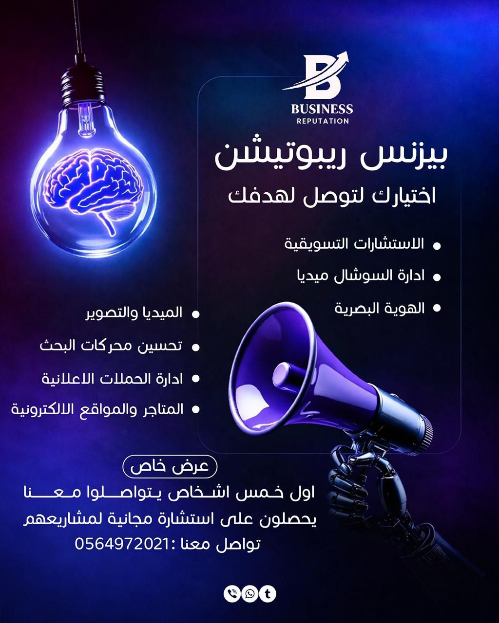 خدماتنا في بزنس ريبوتيشن نقدم لك حلول تسويقية متكاملة تساعدك على الوصول لهدفك وبناء حضور قوي لعلامتك التجارية، وتشمل خدماتنا الاستشارات التسويقية تحليل وضعك الحالي ووضع خطط تسويقية مدروسة تناسب نشاطك. إدارة منصات التواصل الاجتماعي انشاء المحتوى، جدولة النشر، التفاعل مع الجمهور وبناء هوية قوية على السوشيال ميديا. تصميم الهوية البصرية تصميم شعار وهوية تعكس قيم علامتك التجارية وتزيد من
