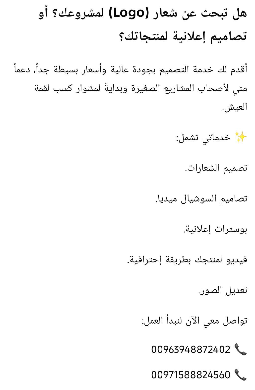 أقدم لكم خدمات تصميم الشعارات والهوية البصرية والتصاميم الاعلانية لعلامتكم التجارية بجودة عالية وأسعار رمزية بسيطة. أسعى من خلال عملي لتطوير مهاراتي وتكوين ذاتي وكسب لقمة العيش بالحلال، مع ضمان تقديم تصاميم متميزة تناسب طموحاتكم وتدعم مشاريعكم الناشئة بأسعار في المتناول