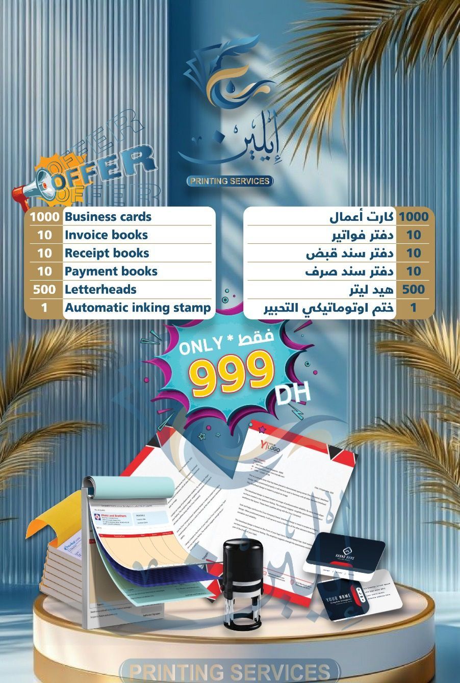 عرض خاص لفترة محدودة ابدأ مشروعك أو طور هويتك التجارية مع باقة طباعة متكاملة العرض يشمل 1000 كارت أعمال 10 دفاتر فواتير 10 دفاتر سند قبض 10 دفاتر سند صرف 500 ورق رسمي (هيد ليتر) ختم أوتوماتيكي السعر المفاجأة فقط 999 درهم