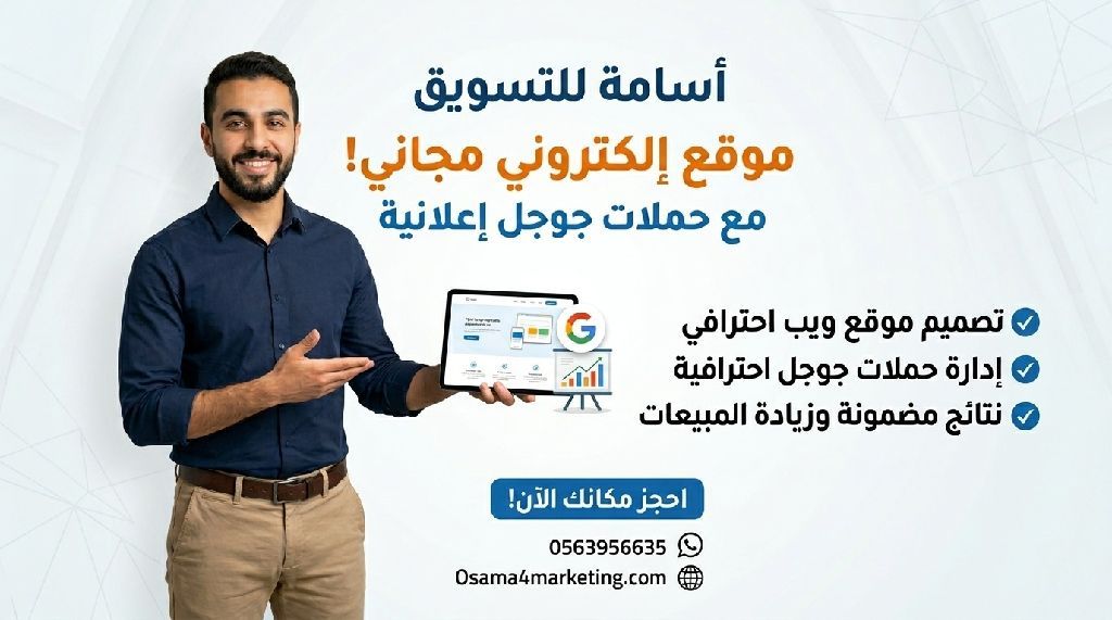 اشترك في إدارة حملات جوجل مع "أسامة للتسويق" واستلم موقعك الالكتروني بدون أي تكلفة اضافية. نستهدف لك الزبائن الصح، ونزيد مبيعاتك بأقل تكلفة. لحق على العرض وتواصل معنا