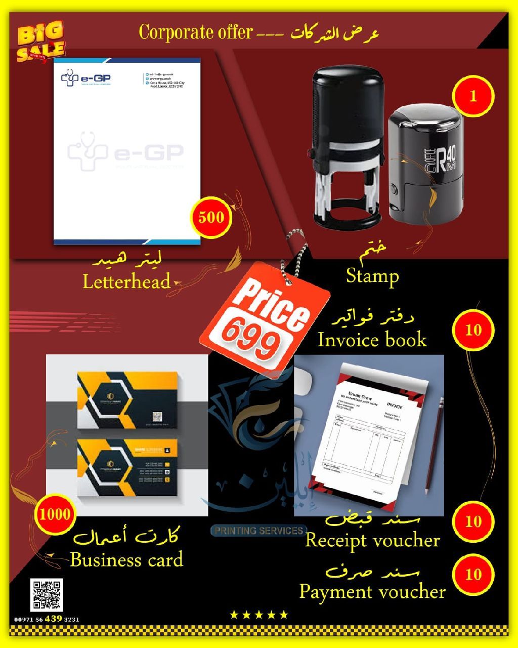 عرض الشركات المميز احصل على باكدج متكامل لشركتك بسعر خاص Letterhead (ورق مكاتبات) 500 ورقة Business Card (كروت أعمال) 1000 كارت Stamp (ختم) 1 قطعة Invoice Book (دفتر فواتير) 10 دفاتر Receipt Voucher (سند قبض) 10 دفاتر Payment Voucher (سند صرف) 10 دفاتر السعر الاجمالي 699 درهم