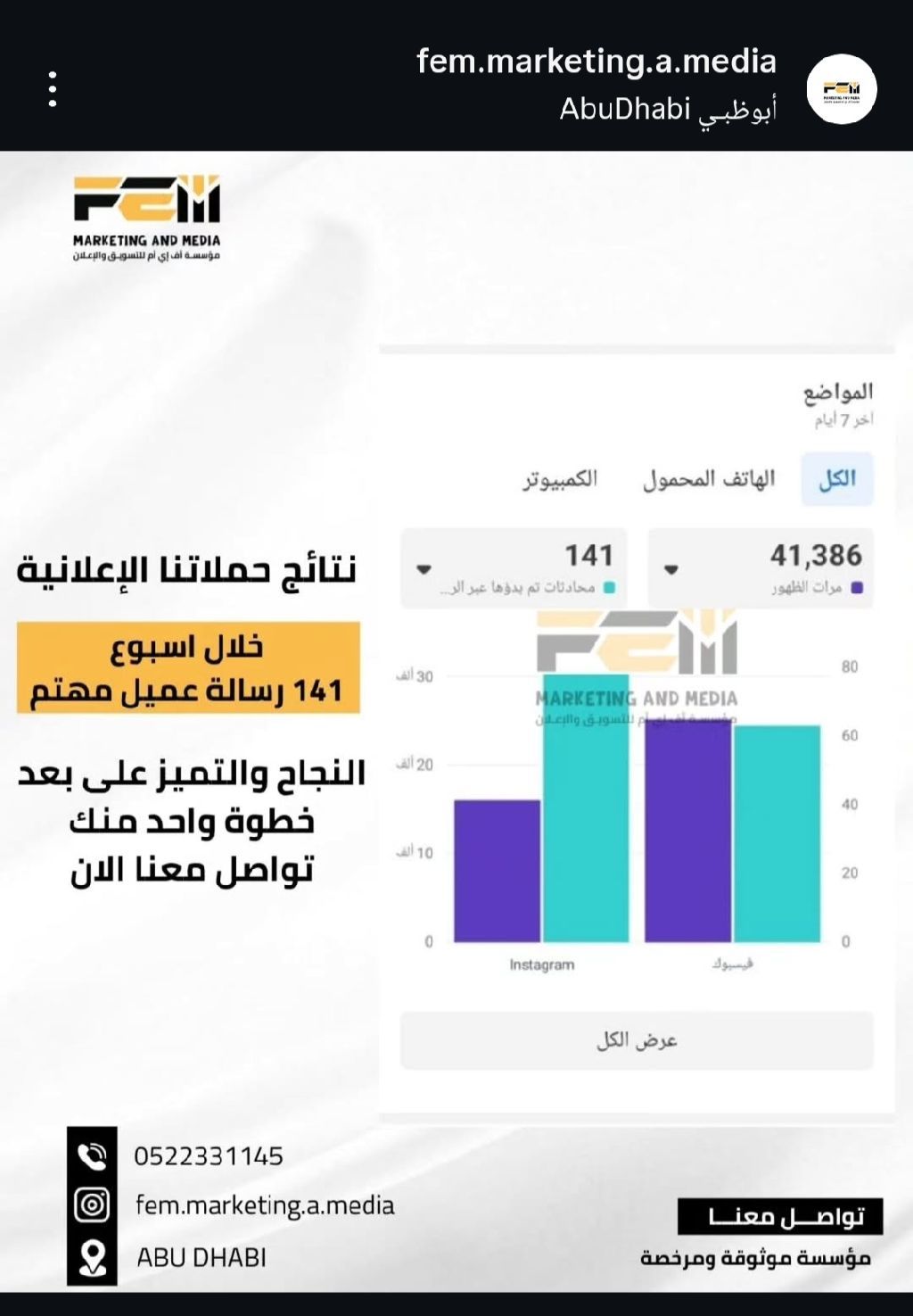 عروض وأسعار تنافسيه لجميع خدمات الاعلانات الممولة والتسويق وادارة حسابات السوشيال ميديا خبرة عالية ونتائج ممتازة واعلان تفصيلي ولفترة محدوده تواصل واستفد من العرض