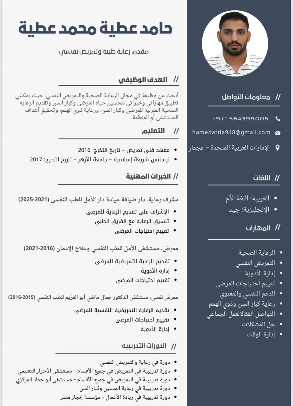 أنا ممرض مصري موجود في دولة الامارات ابحث عن فرصة عمل في مجال الرعاية المنزليه الشامله للمرضي وكبار السن وذوي الهمم والمرضي النفسيين ومرضي الزهايمر وامتلك الخبرة الطويلة في هذا المجال
