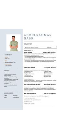 ممرض خبرة 5 سنين + سنة داخل الدولة في مستشفى كليفلا ند كلينيك أبوظبي ومستشفى مدينة شخبوط الطبية عملت مع جميع الأمراض المزمنة (السكري وقدم السكري. ارتفاع ضغط الدم. أمراض الدم مثل سرطان الدم وغيره. أمراض القلب. الزهايمر / الخرف. أمراض الأعصاب والجلطات. وأمراض النفسية والعصبية. ورعاية الجروح المزمنة والبسيطة وقرح الفراش والرعاية الشخصية وإدارة النظام الغذائي للمرضي مع الدعم النفسي والعاطفي لكبار السن)