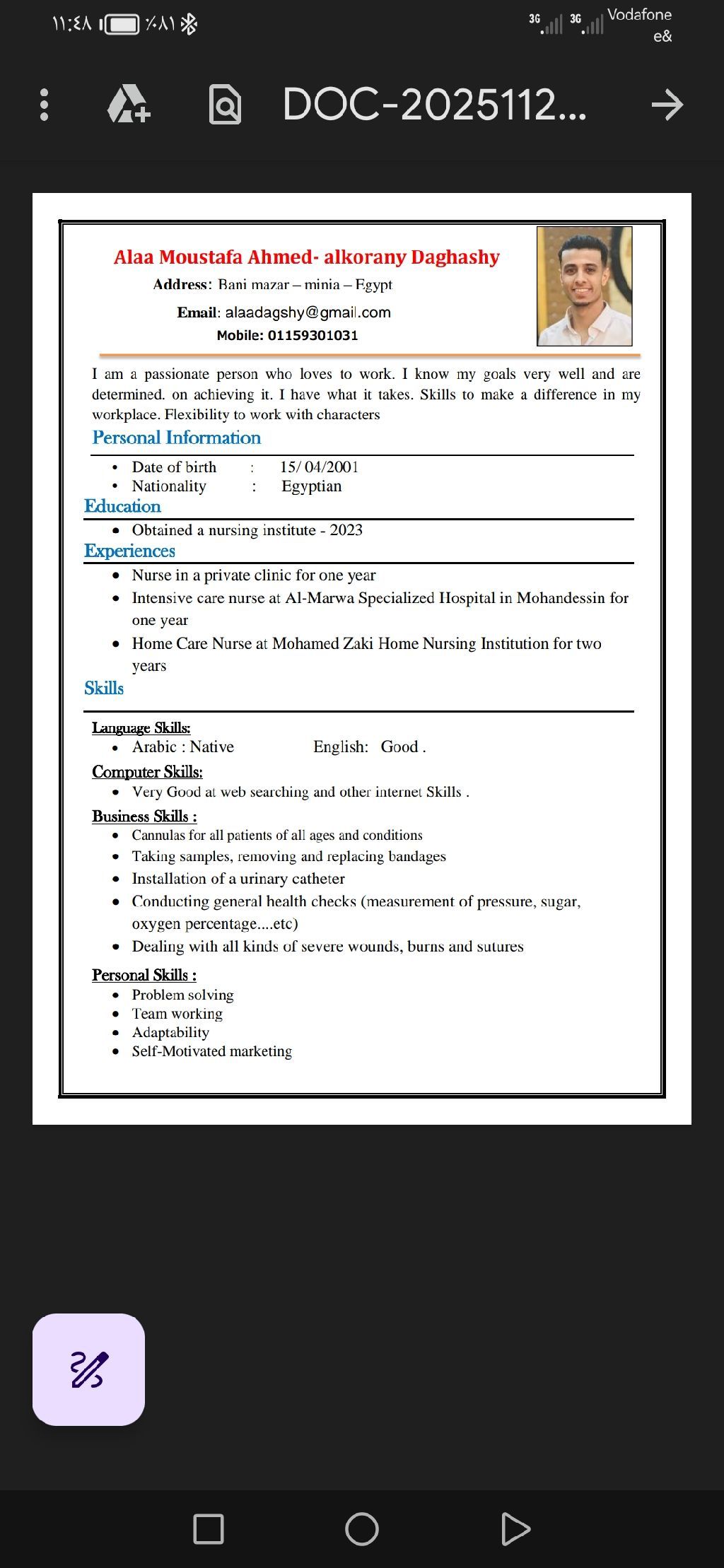 الاسم علاء مصطفى أحمد. العمر 25 عاما. الجنسية مصري. يبحث عن عمل في التمريض المنزلي. جاهز للسفر في أي وقت. الخبرات العملية الحفاظ على سرية العمل والأمانة، وتكفل كل ما يخص المريض من ادوية واحتياجات. المهارات الفردية تركيب كانولات، تركيب قسطرة بولية، اعطاء جميع أنواع الحقن (العضل، الوريدي، وتحت الجلد)