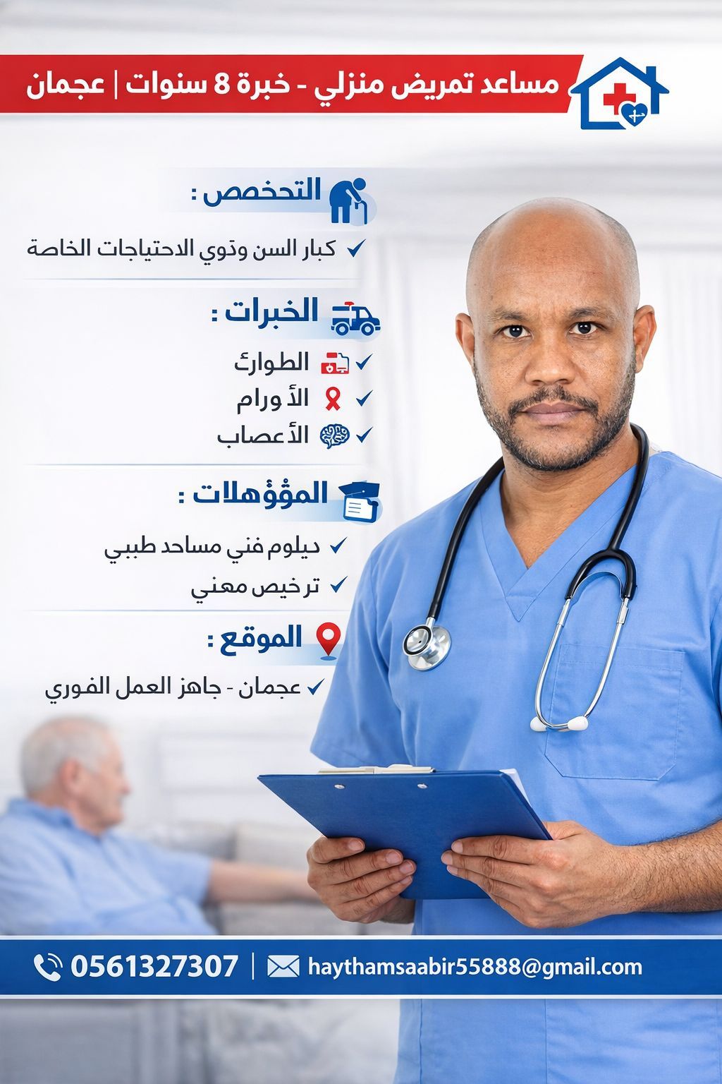 مساعد تمريض منزلي خبرة 8 سنوات - عجمان التخصص رعاية كبار السن وذوي الاحتياجات الخاصة. الخبرة الطوارئ، الاورام، والأعصاب. المؤهل دبلوم فني مساعد طبي + ترخيص مهني + BLS. الوضع جاهز للعمل الفوري من عجمان. للتواصل ايميل
