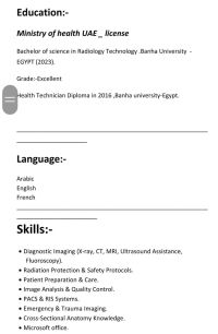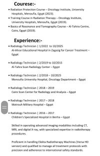 Experienced Radiographer. 8 Years MOH Licensed (UAE) Egyptian radiographer with 8 years of Previously worked in leading hospitals and medical centers inands - on experience in X ray, CT, MRI, and radiation therapy. Skilled in operating advanced imaging equipment and ensuring high - quality diagnostic results