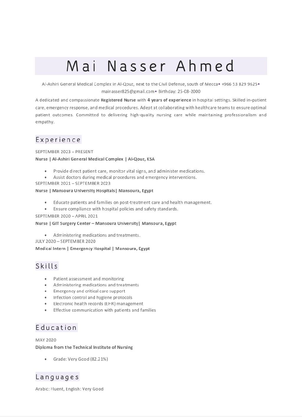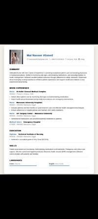 ممرضة مصريه - محترفة خبرة 4 سنوات في مجال التمريض عملت داخل مصر والمملكة العربية السعودية وابحث عن فرصة عمل مناسبة في مؤسسة طبية محترمة. المهارات والخبرات 1 - خبرة في التعامل مع الحالات. 2 - المختلفة داخل المستشفيات والعيادات. 3 - اتقان مهارات التمريض الأساسية والمتقدمة. القدرة على العمل تحت ضغط وبكفاءة عالية. خبرة في التعامل مع اجهزة القياس والتمريض السريري. التزام كامل بمعايير السلامة والجودة