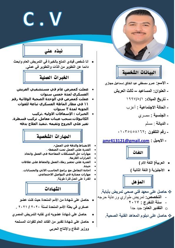 I have extensive experience, having worked as a nurse in the Egyptian Armed Forces, and I am seeking a job opportunity for self - development