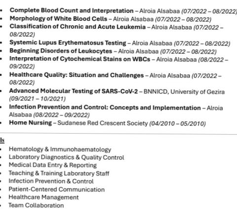 طبيب عمومي بخبرة عالية أكثر من 13 سنة في مختلف الأقسام وخاصة. الطوارئ والعيادات بالاضافة الى خبرة سنتين في الجراحة العامة كنائب أخصائي في السودان حاصلة على DHA license وامتلك اقامة قابلة للإعارة