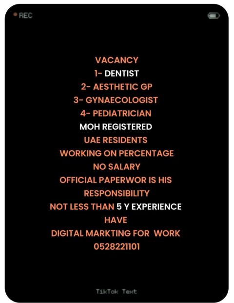 مطلوب للتعيين طبيب عام GP وطبيب أسنان DENTIST للعمل بمركز طبي في الشارقة منطقة المجاز شرط تواجد ترخيص MOH يرجى ارسال أل CV على الرقم