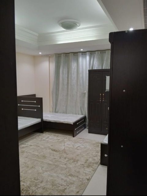 Beds available for male employees in a quadruple room for AED700 in Al Majaz 3, next to Anbar and Nesto. The apartment is clean, organized, quiet, and located in a lively area