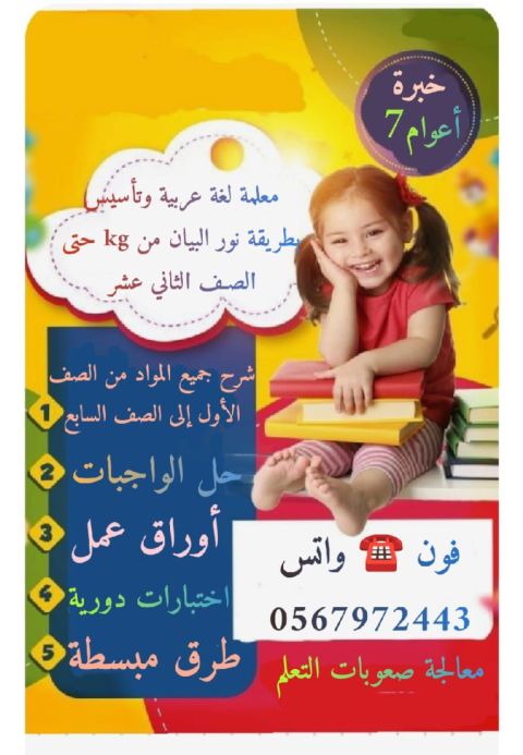 معلمة لغة عربية ذات خبرة طويلة في تأسيس الاطفال الضعاف ومعالجة صعوبات التعلم وضعف التركيز بداية من مسكة القلم حتى يكون الطالب متمكن من القراءة والكتابة والإملاء بمفرده وتأسيس الاطفال للدخول الى المدرسة وتأسيسهم في القواعد النحوية وكيفية كتابة موضوعات التعبير وتحسين الخط بأبسط الطرق وتدريس جميع المواد من الصف الأول حتى الصف السابع وتدريس مادة اللغة العربية من الصف الأول حتى الصف الثاني عشر