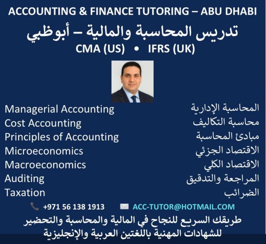 مدرس مصري لمواد المحاسبة والمالية حاصل على زمالة جمعية المحاسبين الاداريين الأمريكية CMA والمعايير الدولية للتقارير المالية IFRS من المملكة المتحدة. خبرة أكثر من 12 عام في الامارات في تدريس المحاسبة الادارية والمالية والتكاليف وادارة الأعمال والمراجعة والضرائب والتحليل والرقابة المالية باللغتين العربية والانجليزية بطريقة مبسطة وربط الواقع العملي بالمناهج النظرية