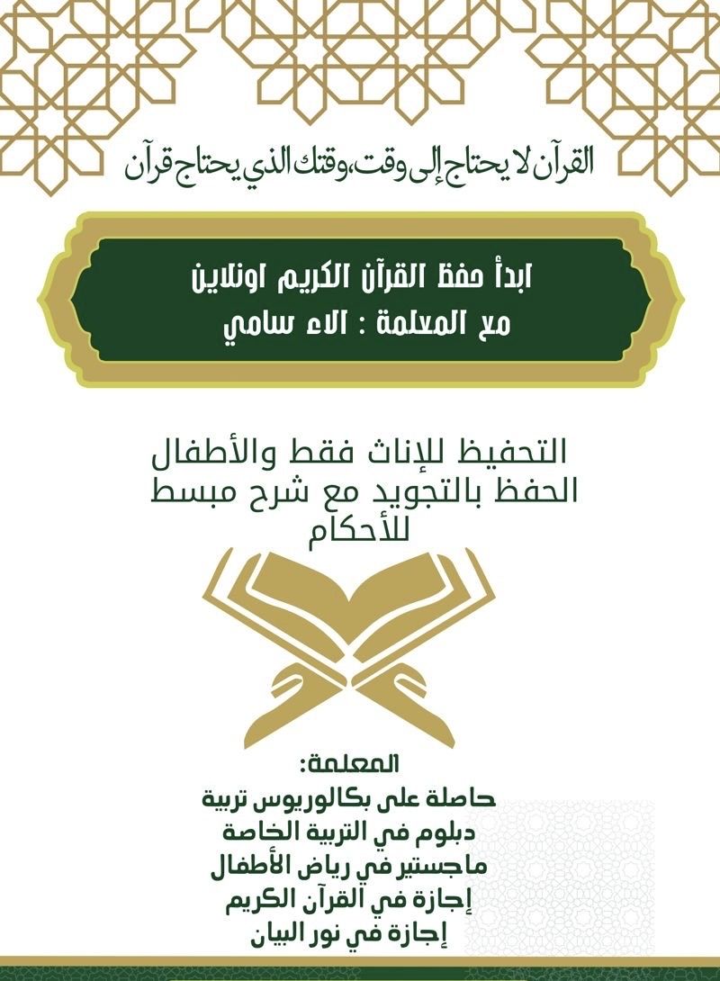 آلاء الرحمن لتحفيظ القرآن الكريم وتأسيس الاطفال. بكالوريوس تربية لغة عربية إجازة في القرآن الكريم ماجستير في العلوم التربوية إجازة في نور البيان الخدمات تدريس اللغة العربية والتربية الاسلامية والعلوم الشرعية (الفقه، التفسير، الحديث، السيرة النبوية، قصص الأنبياء)