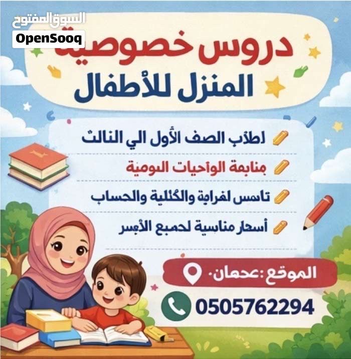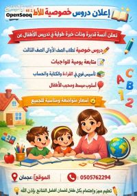 اعلان دروس خصوصية للاطفال تعلن آنسة قديرة وذات خبرة طويلة في تدريس الاطفال عن تقديم دروس خصوصية لطلاب الصف الأول الى الصف الثالث متابعة يومية للواجبات تأسيس قوي في القراءة والكتابة والحساب أسلوب مبسط ومحبب للاطفال أسعار متواضعة ومناسبة للجميع الموقع عجمان للتواصل تعليم مميز واهتمام بكل طفل لضمان أفضل النتائج بإذن الله