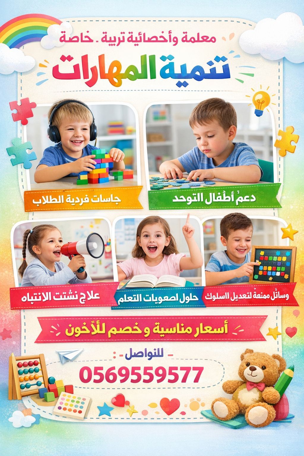 معلمة وأخصائية تربية خاصة - تأسيس وجلسات فردية للاطفال التخصصات والخبرات تأسيس الطلاب لجميع الصفوف الابتدائية دعم الطلاب ذوي صعوبات التعلم جلسات فردية للاطفال المصابين ب التوحد معالجة تشتت الانتباه تعديل السلوك بطريقة ممتعة وجاذبة تنمية المهارات الذهنية والاجتماعية للاطفال