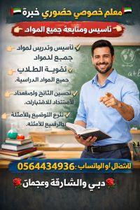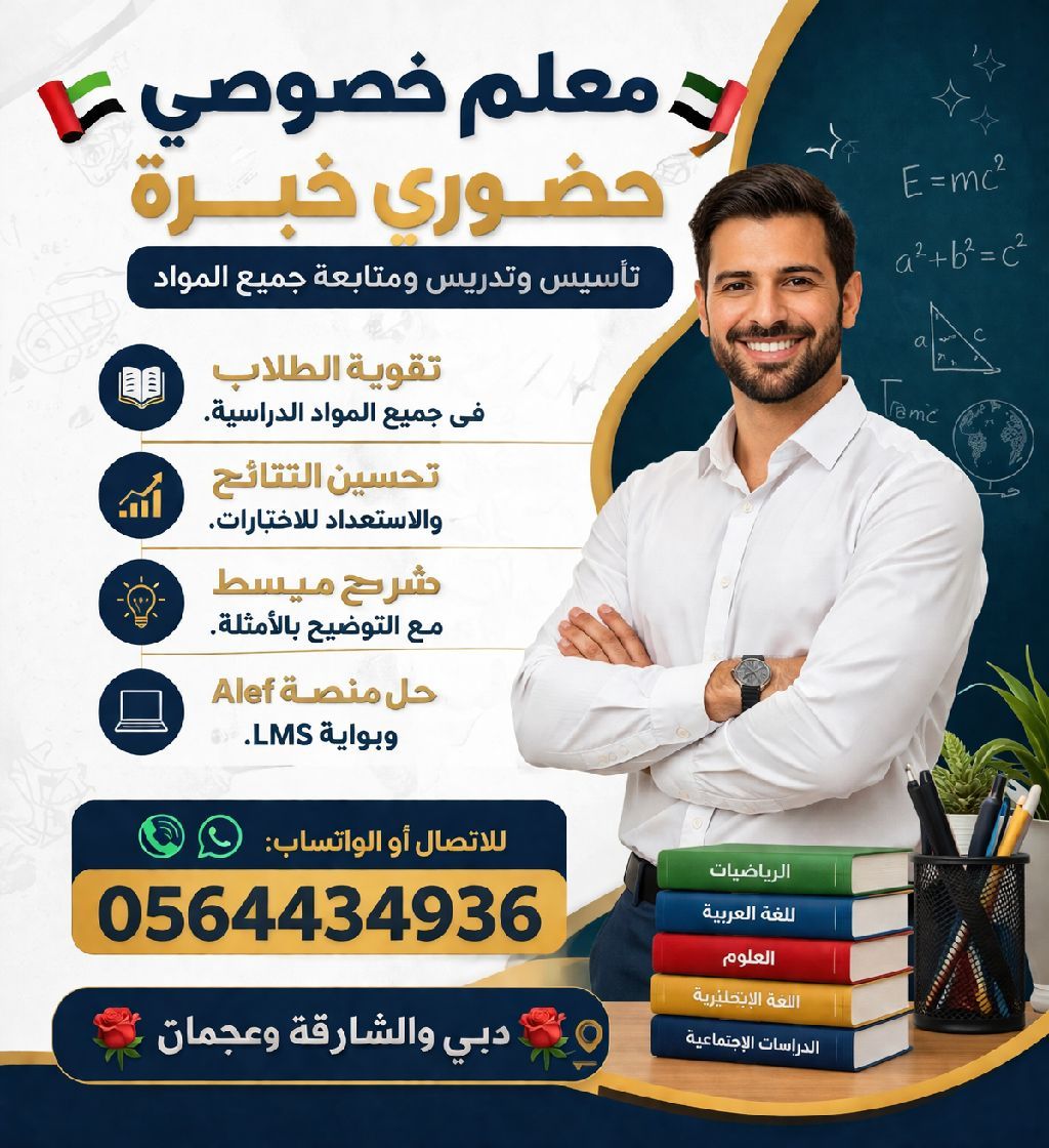 معلم خصوصي حضوري خبرة تأسيس وتدريس ومتابعة جميع المواد. تقوية الطلاب في جميع المواد الدراسية. تحسين النتائج والاستعداد للاختبارات. شرح مبسط مع التوضيح بالامثلة. حل منصة Alef وبوابة lMS. للاتصال أو الواتساب دبي والشارقة وعجمان