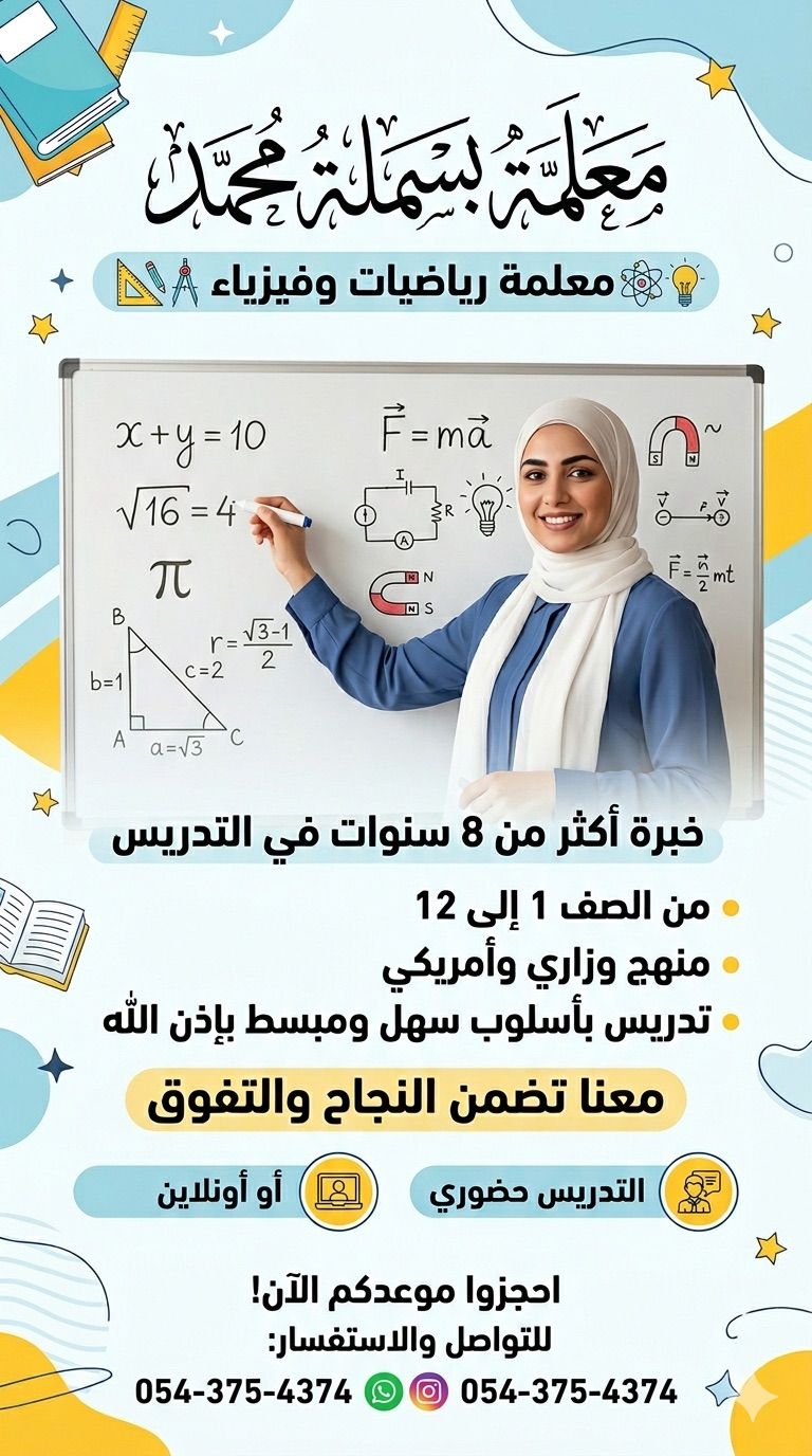 معلمة رياضيات وفيزياء خبرة من 8 سنوات في التدريس من صف 1 الى 12 منهج وزاري وأمريكي تدريس بأسلوب سهل وبسيط بإذن الله معنا تضمن النجاح والتفوق التدريس حضوري أو اونلاين والله الموفق