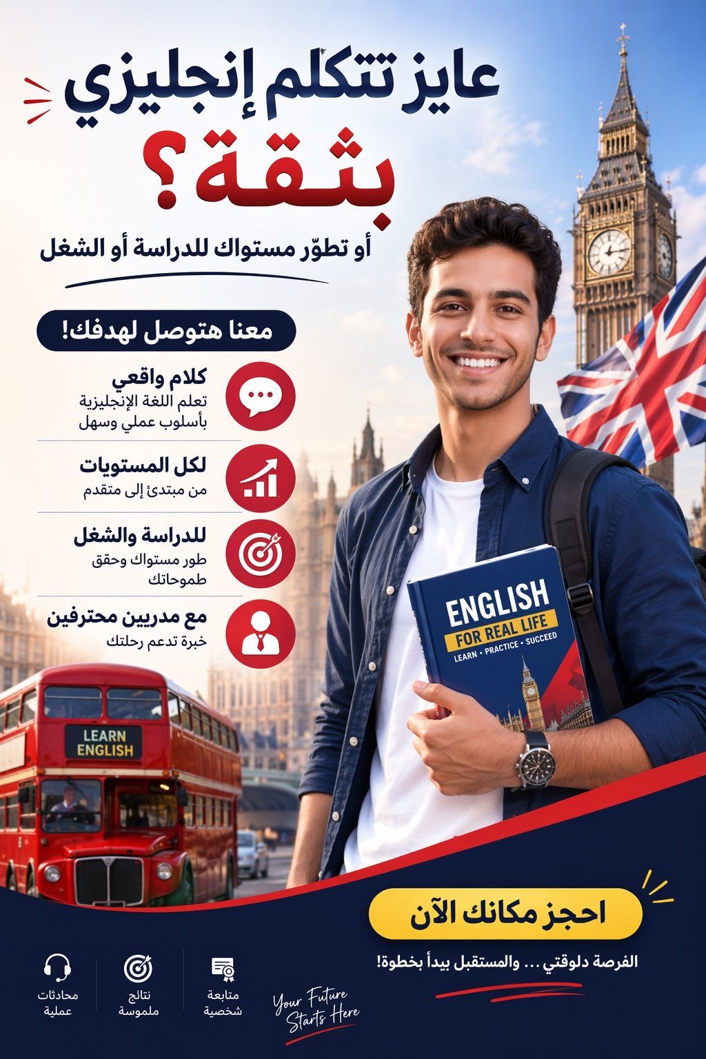 كورس تعليم اللغة الانجليزية تأسيس من الصفر، تطوير كل المهارات، وGeneral English بطريقة تفاعلية مع تدريب عملي ومتابعة مستمرة. كورس IELTS تحضير Academic وGeneral مع تدريب على الامتحان وتقنيات الحل والوصول للدرجه المطلوبه. الكورسات اونلاين من أي مكان، والهدف انك تستخدم الانجليزي بثقة في حياتك مش تحفظه بس. الأماكن محدودة فاحجز دلوقتي