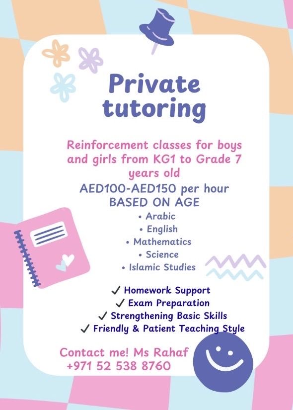 مدرسة لغة عربية وانجليزية ورياضيات وعلوم من الروضة حتى الصف 6 مع امكانية المجيئ الى المنزل ذات خبرة في التدريس المنهاج البريطاني والأمريكي والحكومي أكثر من 4 سنوات في دبي الشارقة وعجمان يرجى التواصل على الرقم مس رهف