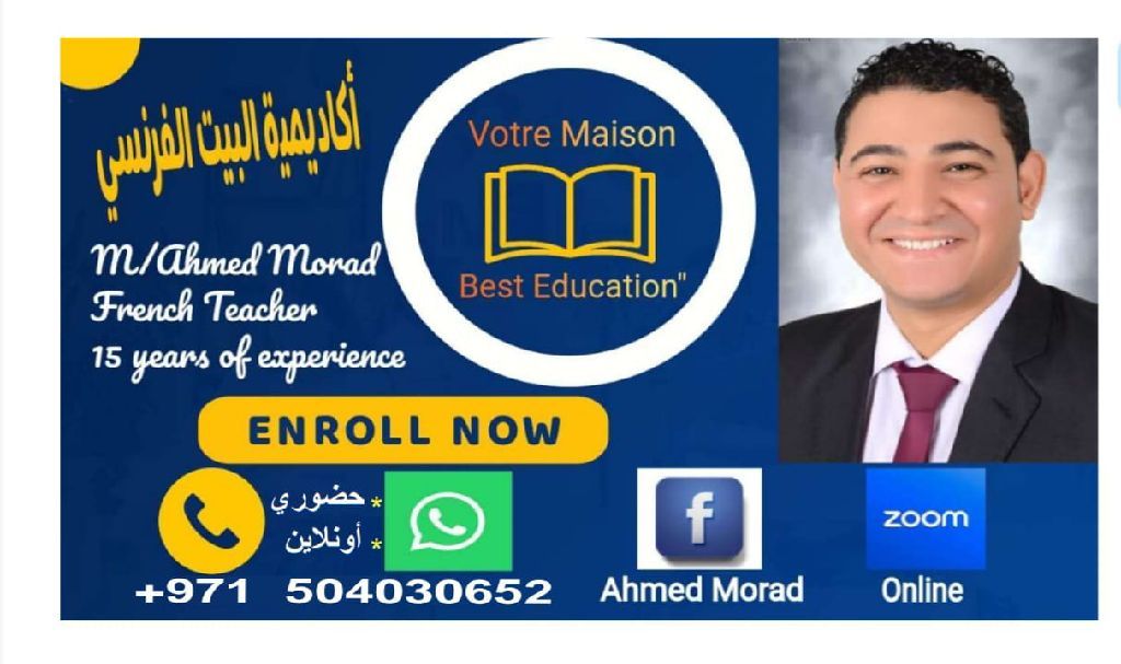 M/ Ahmed Morad French teacher for all grades in any emirate, at home or online experience more than 15 years (8 sessions per month)