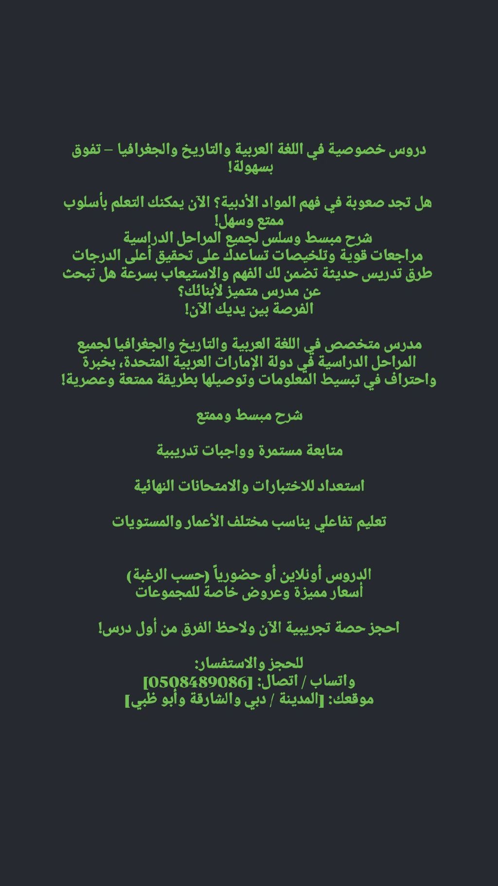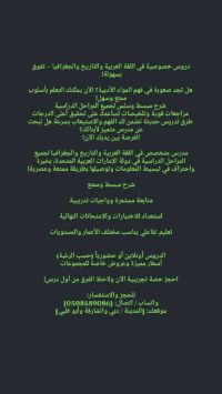 Looking for an outstanding tutor for your children The opportunity is here A specialized tutor in Arabic Language, History, and Geography for all academic levels across the United Arab Emirates, with extensive experience in simplifying and delivering information in a fun and modern way Simplified and enjoyable explanations Continuous follow - up and training assignments