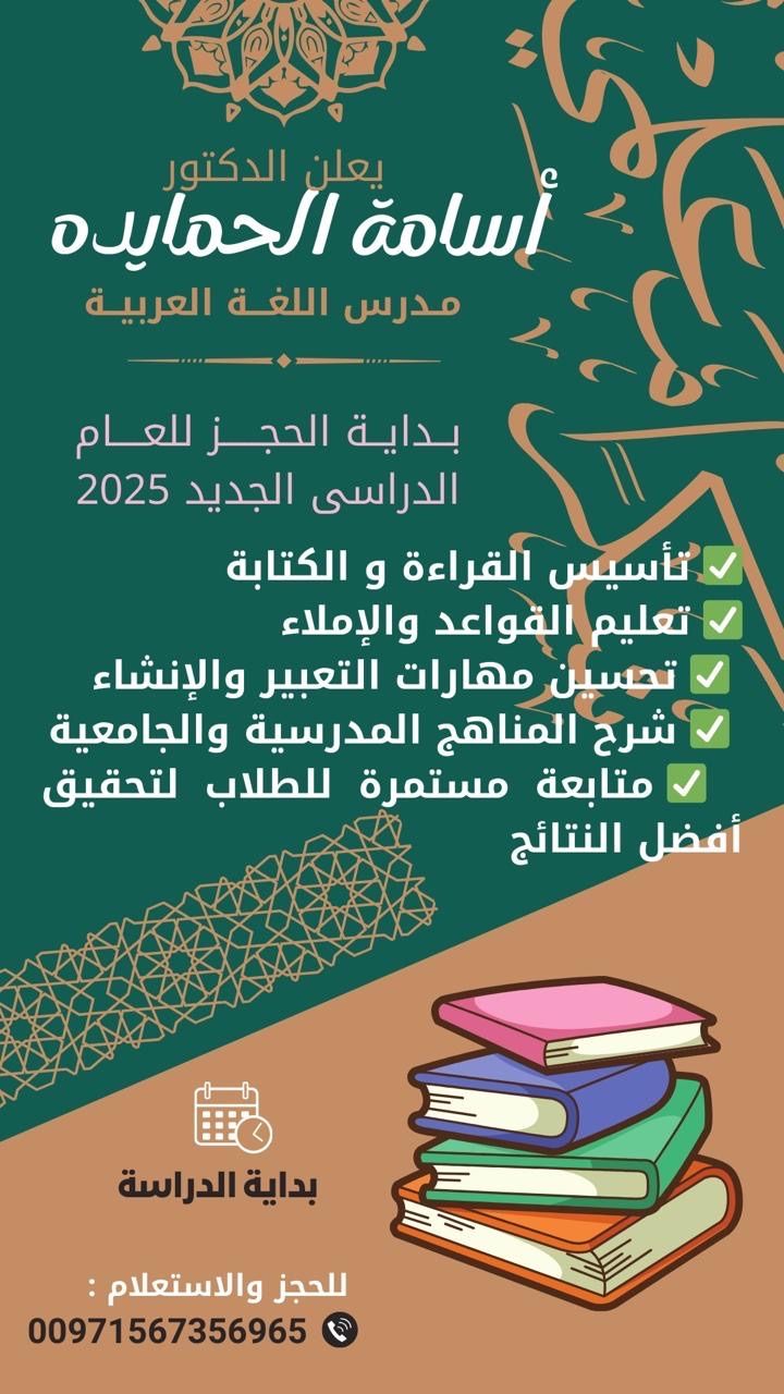 دروس خصوصية في اللغة العربية والتربية الاسلامية مميزات الدروس شرح مبسط يناسب جميع المراحل. متابعة مستمرة لمستوى الطالب. تعليم يجمع بين المعرفة والقيم. تعليم يرسخ الفهم ويبني الثقة