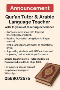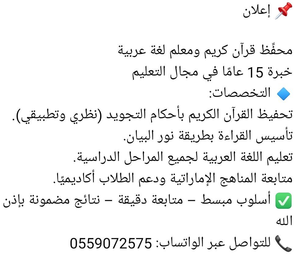 اعلان محفظ قرآن كريم ومعلم لغة عربية خبرة 15 عاما في مجال التعليم التخصصات تحفيظ القرآن الكريم باحكام التجويد (نظري وتطبيقي) تأسيس القراءة بطريقة نور البيان. تعليم اللغة العربية لجميع المراحل الدراسية. متابعة المناهج الاماراتية للتواصل هاتفيا أو عبر واتساب على رقم