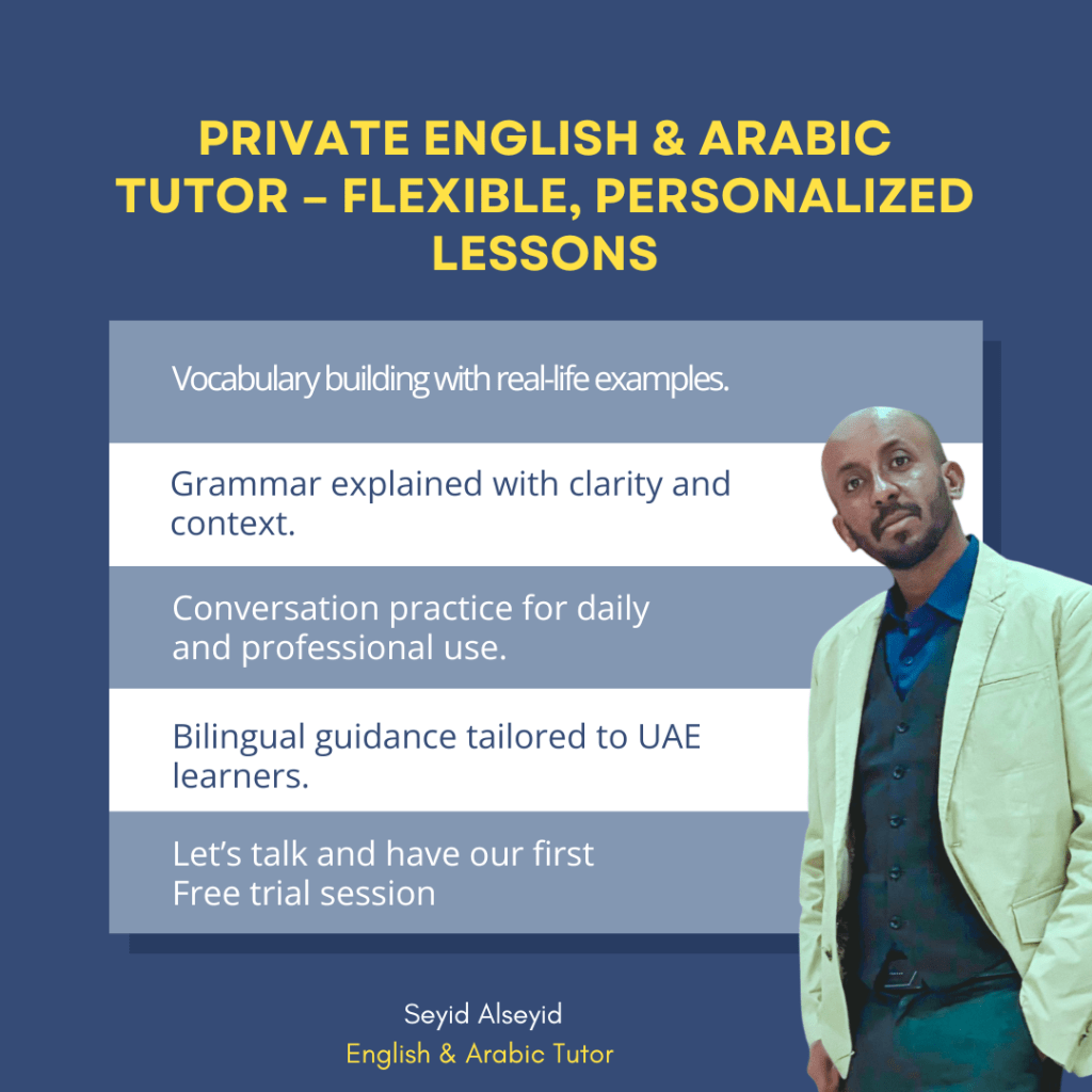 Private English & Arabic Tutor - Flexible, Personalized Lessons Boost your language skills with one - on - one tutoring tailored to your goals. I offer personalized lessons in English and Arabic for students, professionals, and job seekers. Whether you're preparing for exams, improving conversation, or mastering grammar, I adapt to your pace and needs. Online or in - person sessions available. Contact